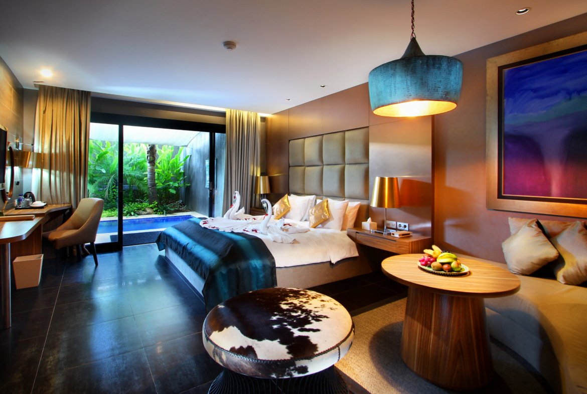 The spacious Pool Suites features 43 square meters designed to deliver truly great value unlike any other Bali hotel room. Equipped from top to bottom with superior quality amenities and facilities, the Pool Suite is the best choice for guests with the most exquisite taste. Designed for up to 2 people, in addition to the private pool, the rooms also provide a state-of-the-art flat-screen TV with a choice of Indonesian and international satellite channels, a safe for your valuable, iron and ironing board, free high-speed Wi-Fi, air-conditioning and a stylish private bathroom will a full set of amenities.